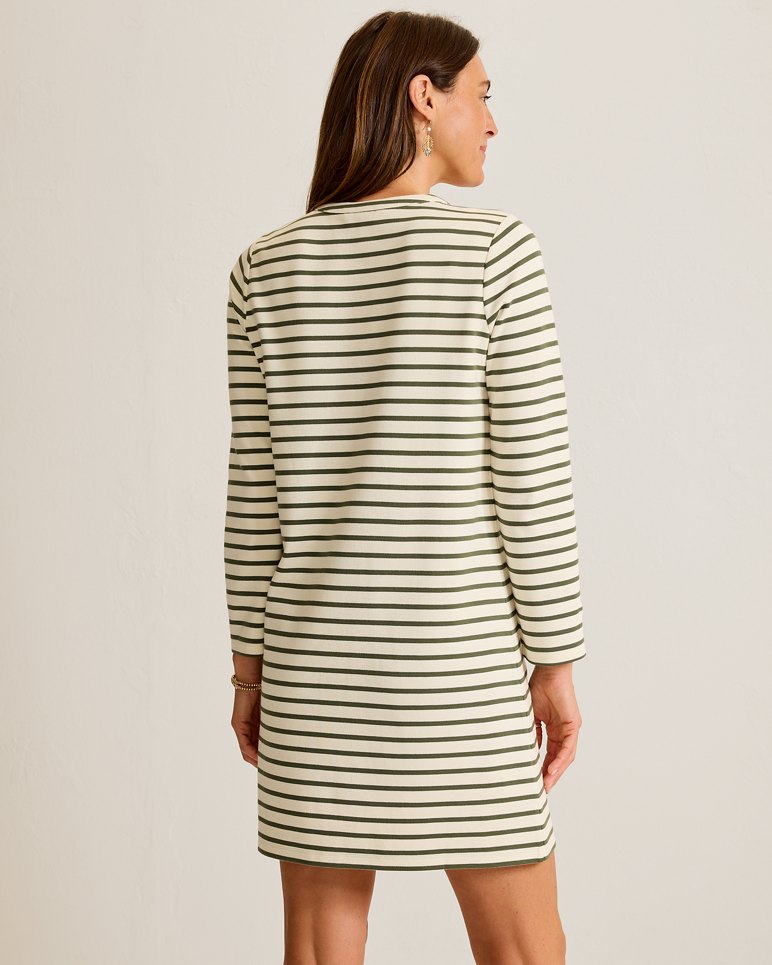 A supremely soft, premium cotton-blend striped dress brings season-spanning versatility to everyday outfitting in an ideal style for transitional weather and into the holidays.