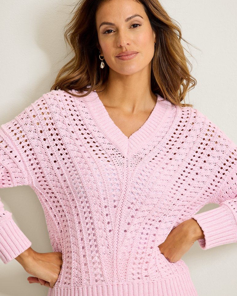 It’s full sail for sunshine in this nautically inspired, 100% cotton V-neck with a beachy open-knit design. Exaggerated raglan sleeves and ribbed trim details create a charming sense of contrast to make this sweater feel both relaxed and elevated.
