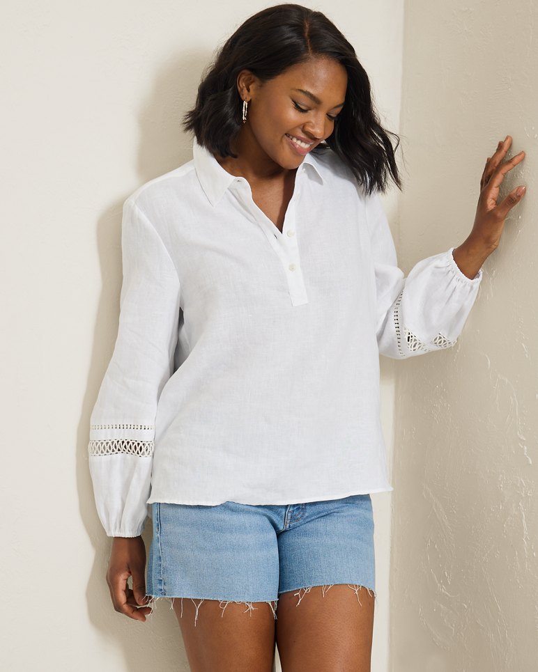 Elegant lace inserts and on-trend balloon sleeves add elevated flair to this easy, feminine popover top, crafted from our five-star Coastalina linen.