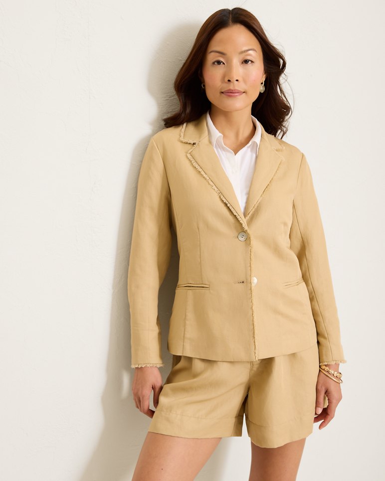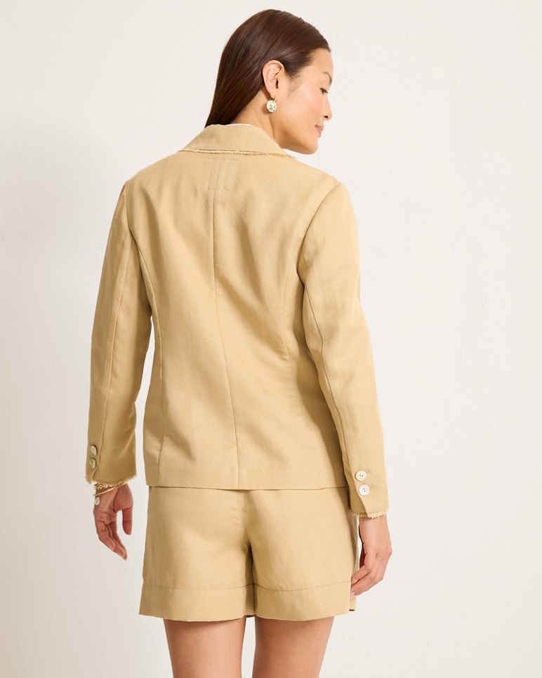 Effortless frayed edges add a touch of bohemian flair to this otherwise polished blazer silhouette, crafted from a lightweight linen blend with a flattering drape.