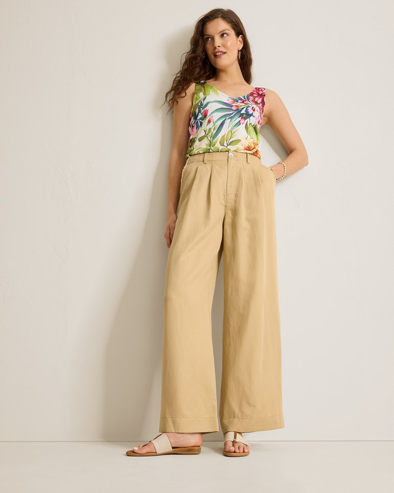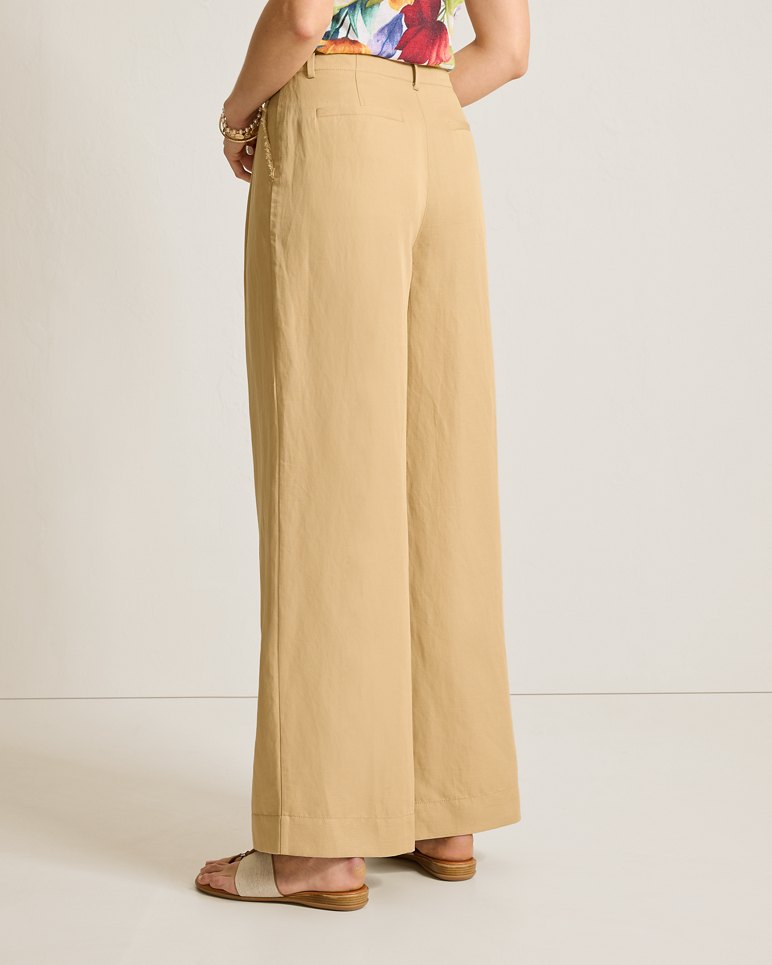 A sophisticated wide-leg silhouette with subtle pleats at the hips creates a polished pair of trousers, crafted from an ultra-comfortable linen blend with easy stretch and an effortless drape.