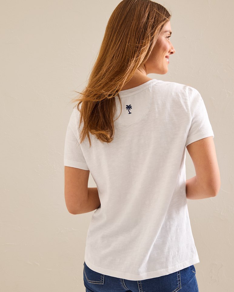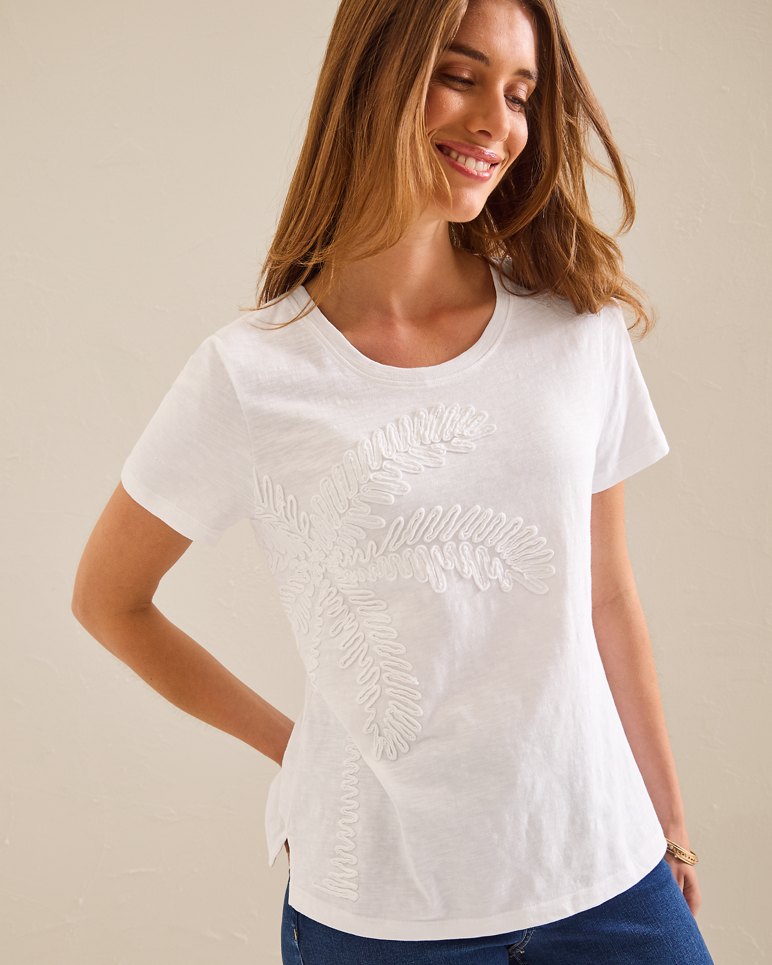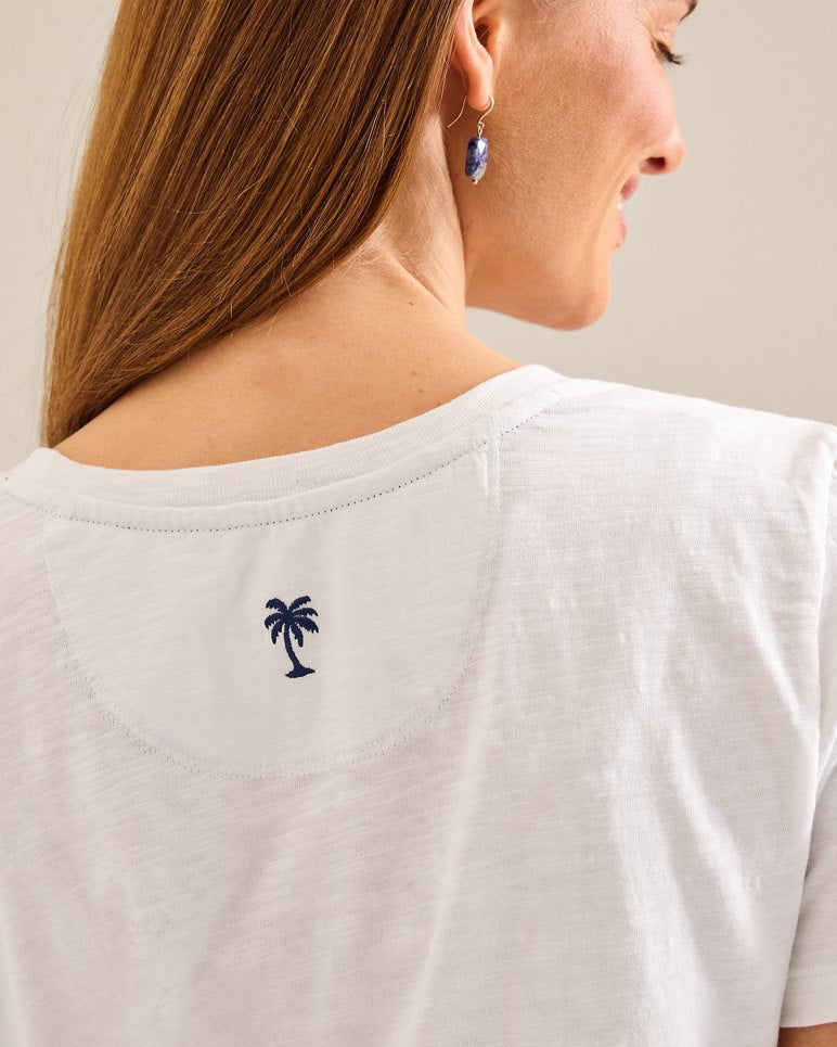 Nod to your vacation state of mind in an elevated white tee for the everyday, featuring an embroidered palm tree design and crafted from exceptionally soft organic cotton.