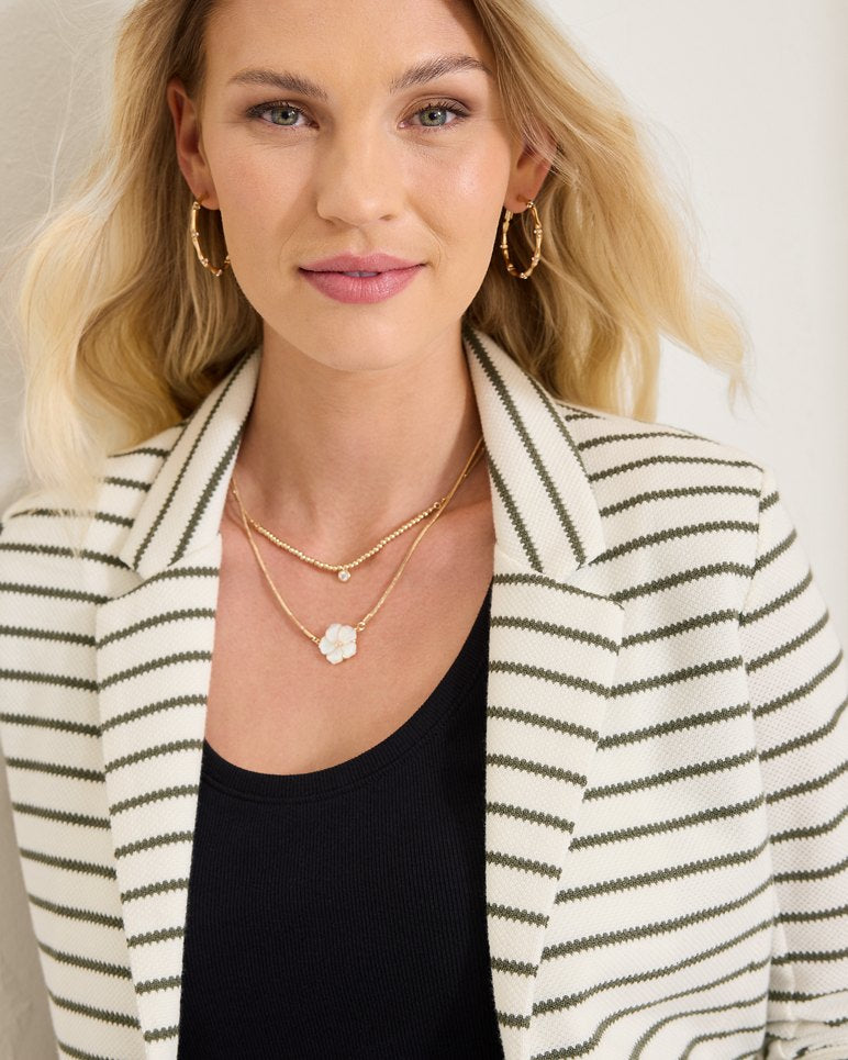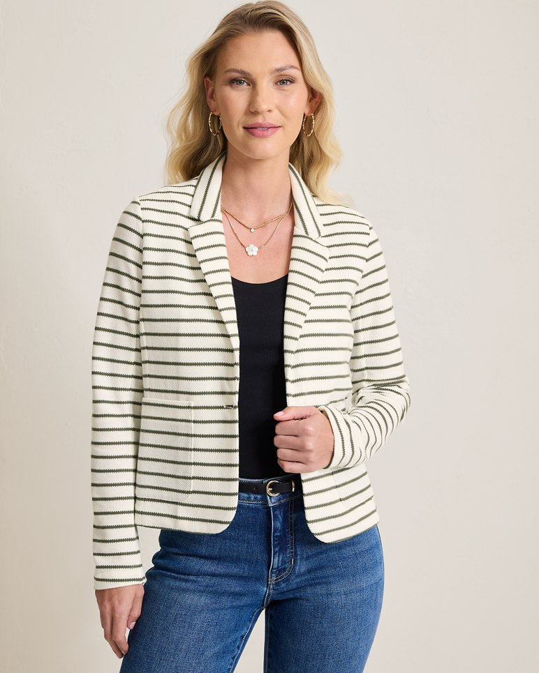 Featuring an elevated piqué texture and trendy stripe design, this chic blazer is the perfect layer to help sophisticate your casual denim looks.