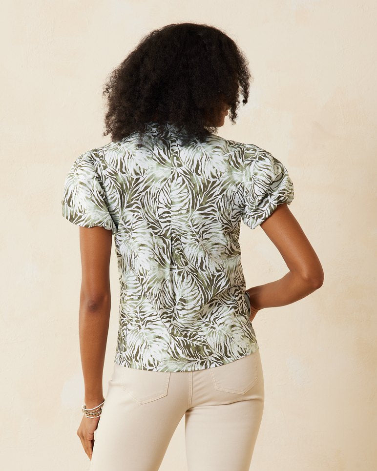 Offering the easy comfort of stretch in its lightweight seersucker fabric, this playful puff-sleeve top makes being on trend look effortless. Details like subtle pleating and a relaxed collar lend a note of sophistication to the look, while the memorable print enlivens your everyday style with the island state of mind.