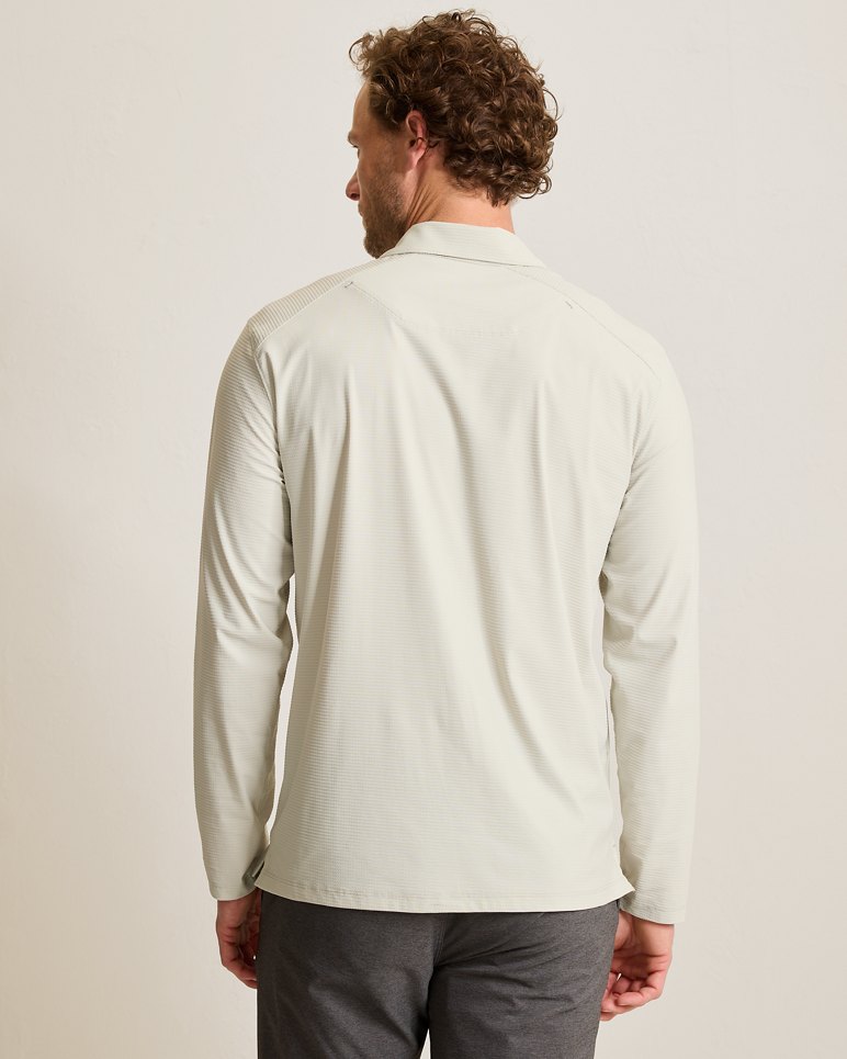 - Long-sleeve half-zip polo with stretch.
