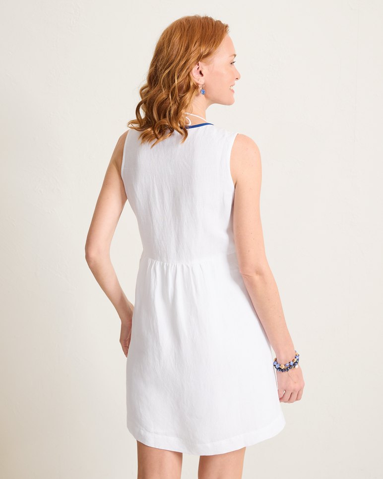 Elegant blue embroidery along the scalloped neckline effortlessly brings contrast and coastal appeal to this chic white coverup dress, crafted from a lightweight linen blend.