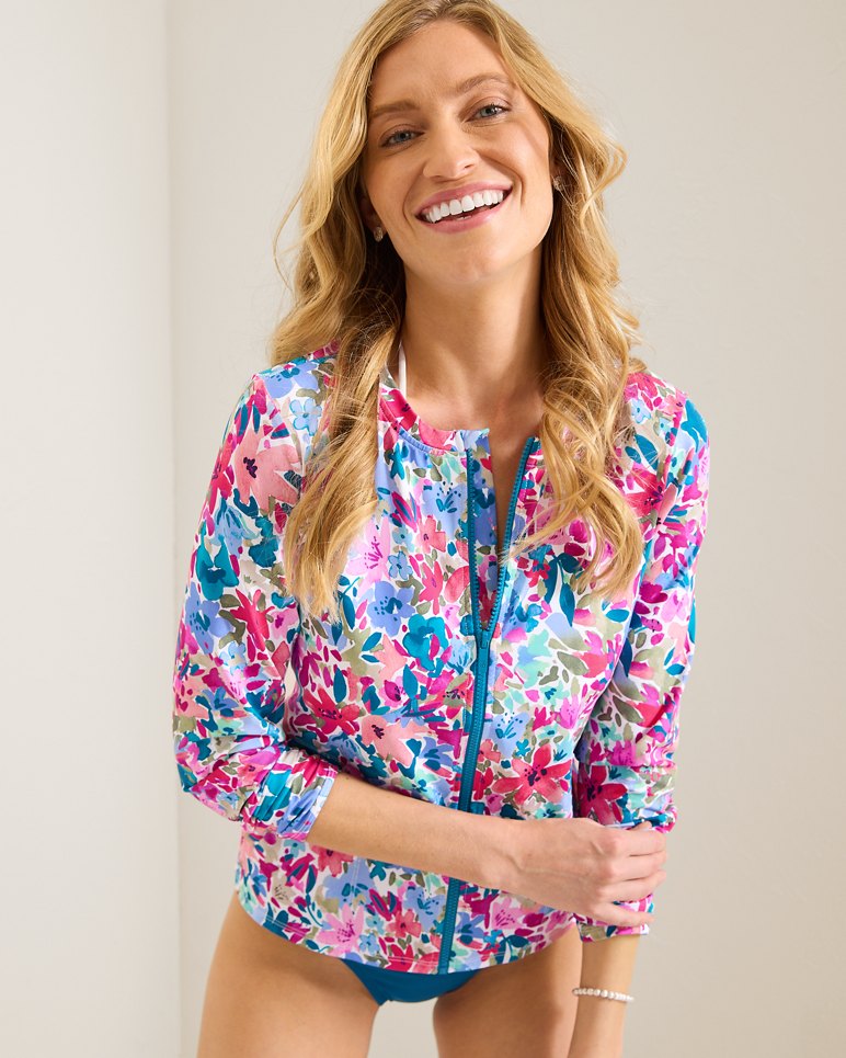 Embrace your island state of mind while feeling protected from the sun in this bold, printed rash guard that offers excellent UV protection for long days under the rays.
